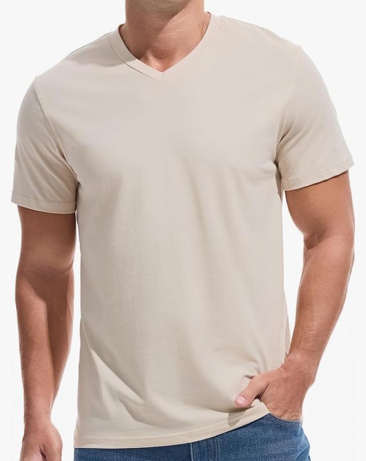 High-quality material: Our Beige Premium V-Neck T-shirts fabric is soft, comfortable, moderately elastic Comfortable fit: The design of the t-shirt is form-fitting, which can show off your body shape well and feels very comfortable to wear. It is suitable for various occasions. Essential T Shirts for Men . Performance Fabric. Wrinkle Resistant Breathable.soft and comfortable. Durability: The material is easy to care for and clean, and the t-shirt does not deform after multiple washes, so it is very durable